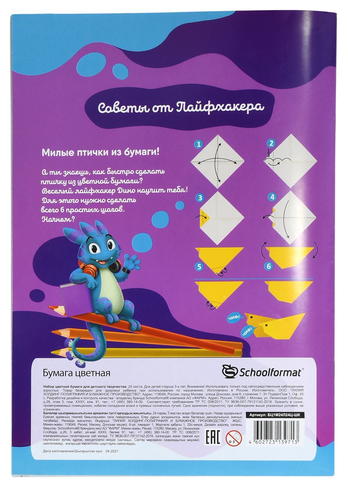 Формат: А4 Плотность, г/м2: 60 Количество листов: 24 Вид продукции для творчества: Бумага цветная Количество цветов: 24 Наличие европодвеса: Нет Мин. партия и варианты упаковок: 1 / 40 Бумага цветная Schoolformat мелованная 24 л. 24 цв. 60 г/м2 на скрепке
