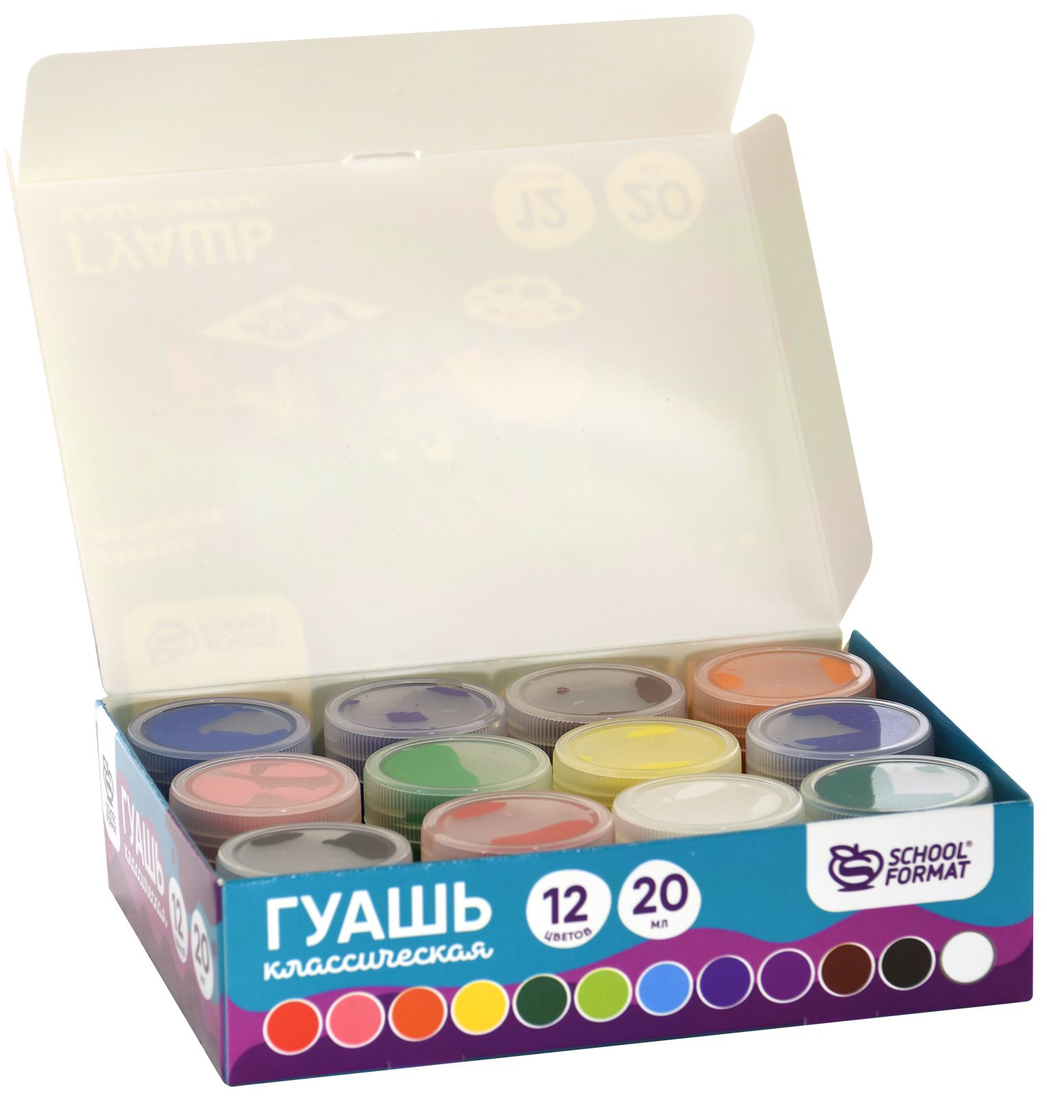 Количество цветов: 12 Тип товара: детские Емкость: набор баночек Цвет: ассорти Серия: Smart Dino Объем, мл: 20,00 Мин. партия и варианты упаковок: 1 / 18 Гуашь Schoolformat Smart Dino 12 цветов по 20 мл ассорти, набор баночек