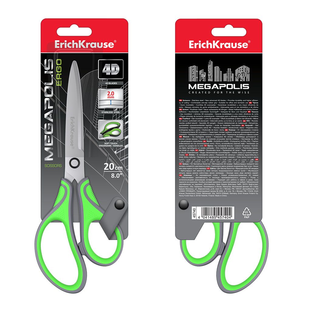 Наличие европодвеса: Да Упаковка: картонная упаковка Серия: MEGAPOLIS ERGO Цвет основной: серо-зеленый Длина ножниц, мм: 200 Длина лезвия, мм: 97 Мин. партия и варианты упаковок: 1 / 12 / 144 Ножницы ErichKrause MEGAPOLIS ERGO 200 мм серо-зеленые, эргономичные ручки пластиковые с резиновыми вставками