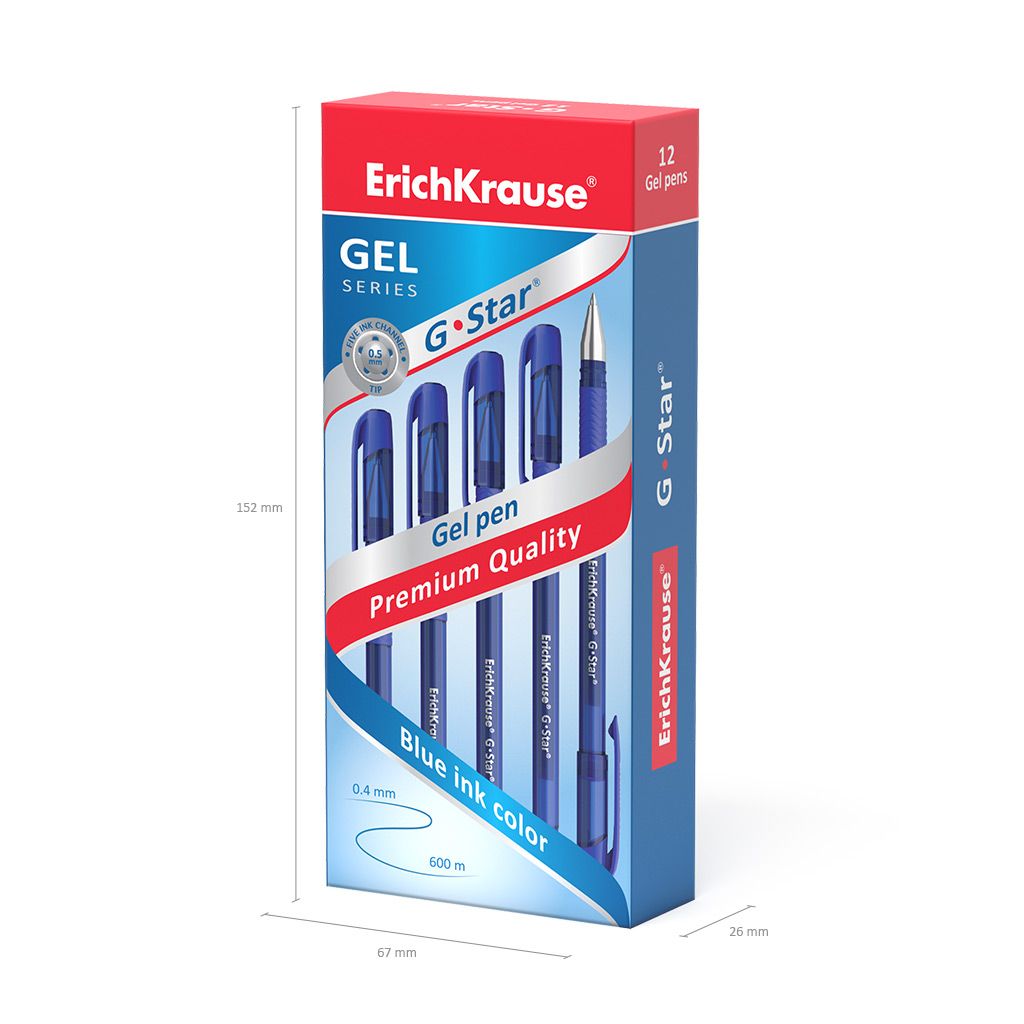 Диаметр, мм: 10 Цвет чернил: синий Вид товара: Ручка гелевая Толщина линии письма, мм: 0,40 Цвет корпуса: синий Наличие резинового грипа: Да Мин. партия и варианты упаковок: 1 / 12 / 1728 Ручка гелевая ErichKrause G-STAR 0,5 мм синяя, круглый корпус, грип